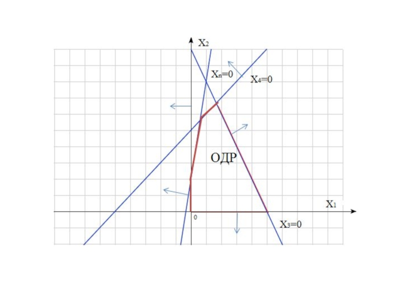 Отложим по осям ОХ1 и ОХ2 значения свободных переменных, а также построим полуплоскости, соответствующие неравенствам (4):
