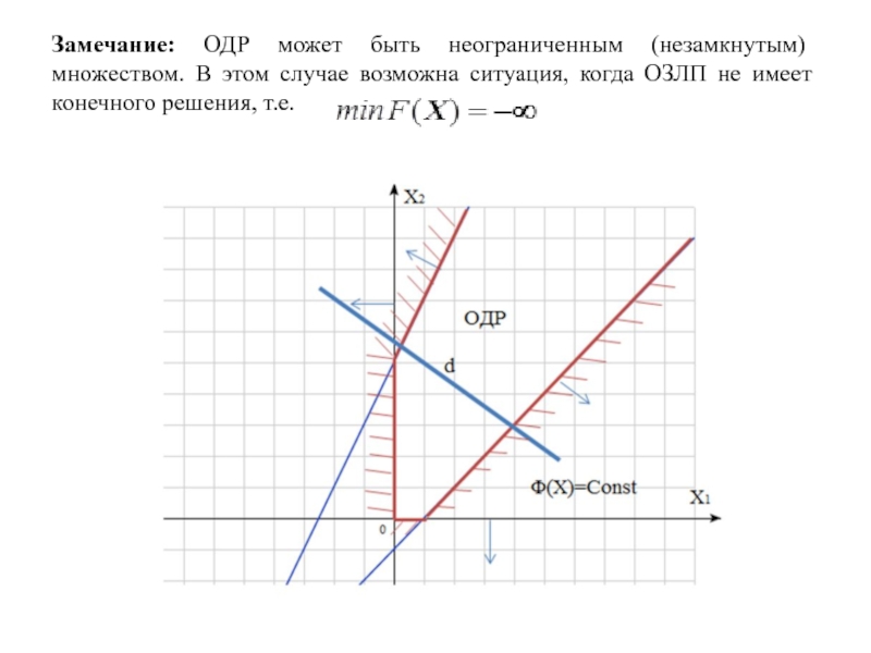 Слайд 11Замечание: ОДР может быть неограниченным (незамкнутым) множеством. В этом случае возможна