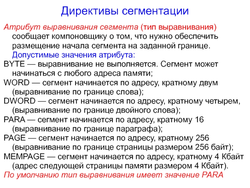 BYTE — выравнивание не выполняется. Сегмент может начинаться с любого адреса памяти;