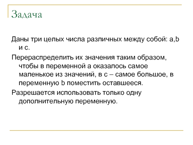 значения таким образом, чтобы в переменной а оказалось самое маленькое из значений, в с – самое большое, в переменную b поместить оставшееся.