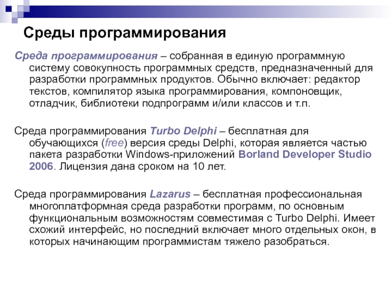 Среда программирования Turbo Delphi – бесплатная для обучающихся (free) версия среды Delphi, которая является частью пакета разработки Windows-приложений Borland Developer Studio 2006. Лицензия дана сроком на 10 лет.