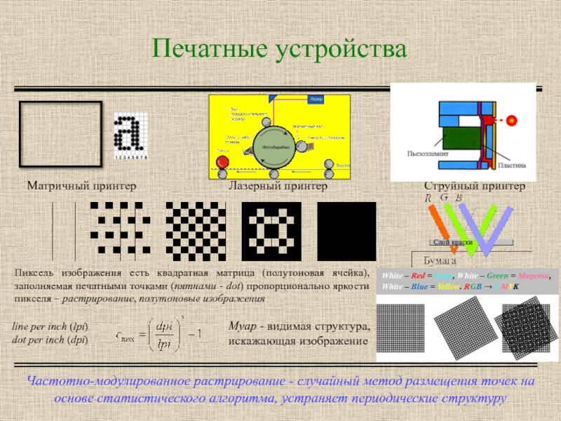 Пиксель изображения есть квадратная матрица (полутоновая ячейка), заполняемая печатными точками (пятнами - dot) пропорционально яркости пикселя – растрирование, полутоновые изображения