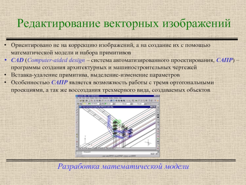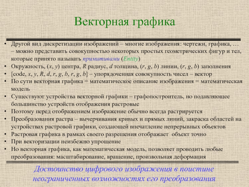 – по векторному описанию (математической модели) объектов создание их растровых изображений. С помощью компьютерной графики создается изображение объектов, которых либо нет в природе (виртуальная реальность), либо они недоступны.