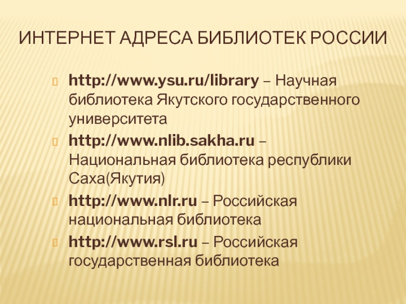 Слайд 5ИНТЕРНЕТ АДРЕСА БИБЛИОТЕК РОССИИ
