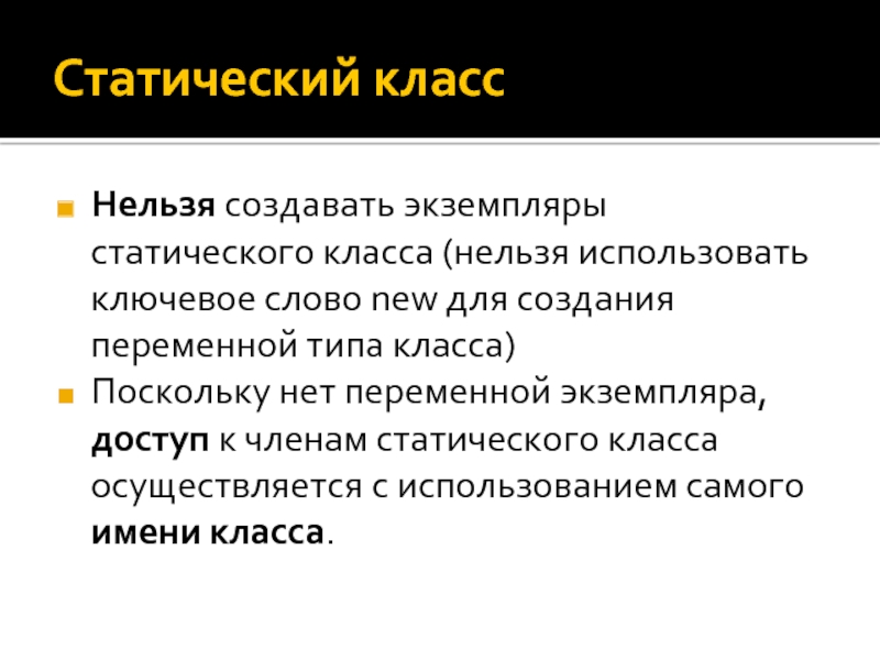 Поскольку нет переменной экземпляра, доступ к членам статического класса осуществляется с использованием самого имени класса.