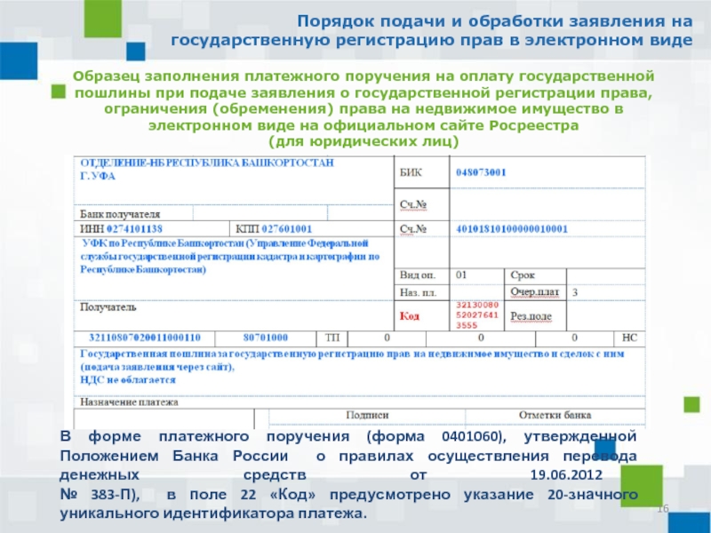 Образец заполнения платежного поручения на оплату государственной пошлины при подаче заявления о государственной регистрации права, ограничения (обременения) права на недвижимое имущество в электронном виде на официальном сайте Росреестра