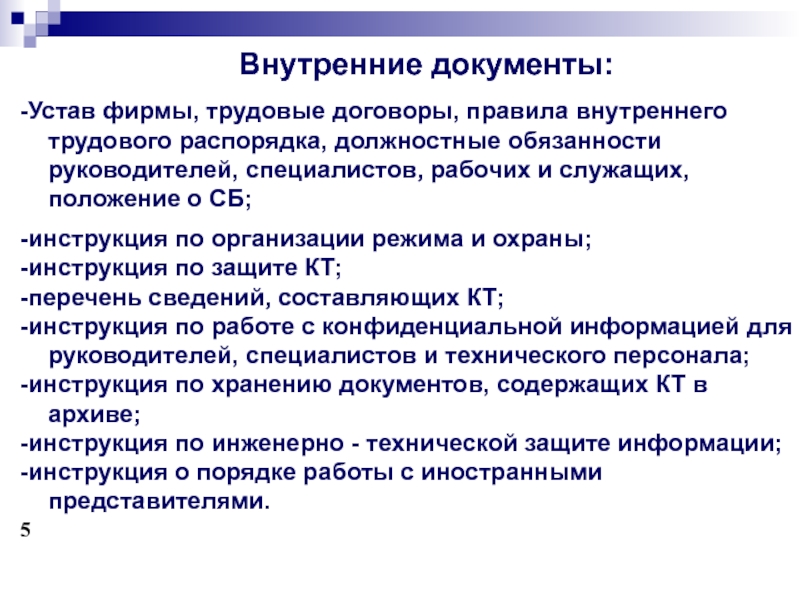 Деятельность СБ должна быть основана на государственных и внутрифирменных нормативных документах.