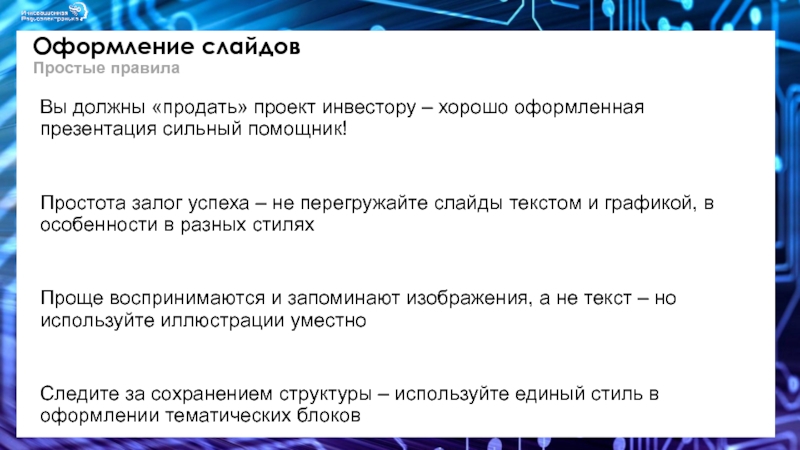 Простота залог успеха – не перегружайте слайды текстом и графикой, в особенности в разных стилях