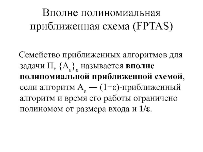для задачи Π, {Aε}ε называется вполне полиномиальной приближенной схемой, если алгоритм Aε ― (1+ε)-приближенный алгоритм и время его работы ограничено полиномом от размера входа и 1/ε.