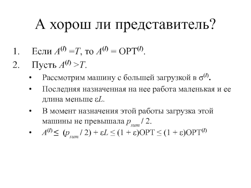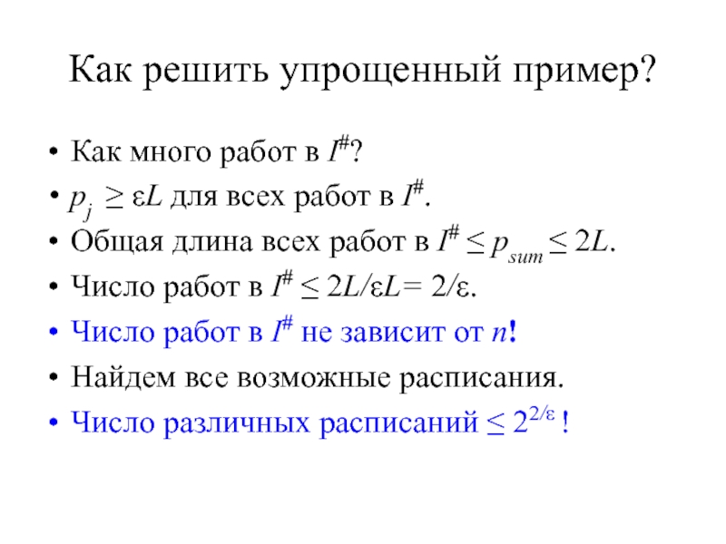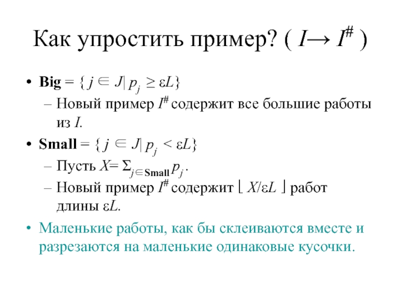 одинаковые кусочки. Рассмотрим другой способ построения упрощенного примера. Рассмотрим множество маленьких работ. Если в нем есть две работы длины меньше чем εL склеим их, то есть две работы с длительностями p′, p′′ < εL заменим одной работой с длительностью p′ + p′′. Продолжим склеивание до тех пор пока в примере останется не больше одной работы с p < εL. Приведет ли такое упрощение к приближенной схеме?