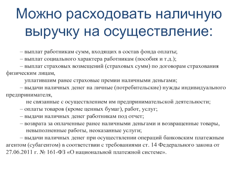 – выдачи наличных денег при осуществлении операций банковским платежным агентом (субагентом) в соответствии с требованиями ст. 14 Федерального закона от 27.06.2011 г. № 161-ФЗ «О национальной платежной системе».