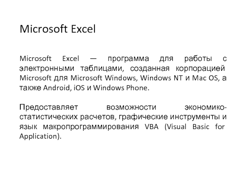 Предоставляет возможности экономико-статистических расчетов, графические инструменты и язык макропрограммирования VBA (Visual Basic for Application).