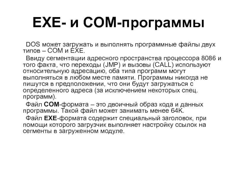 COM-программы содержат единственный сегмент . Образ COM-файла считывается с диска и
