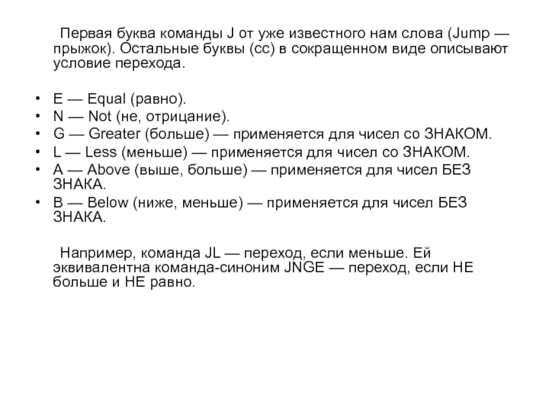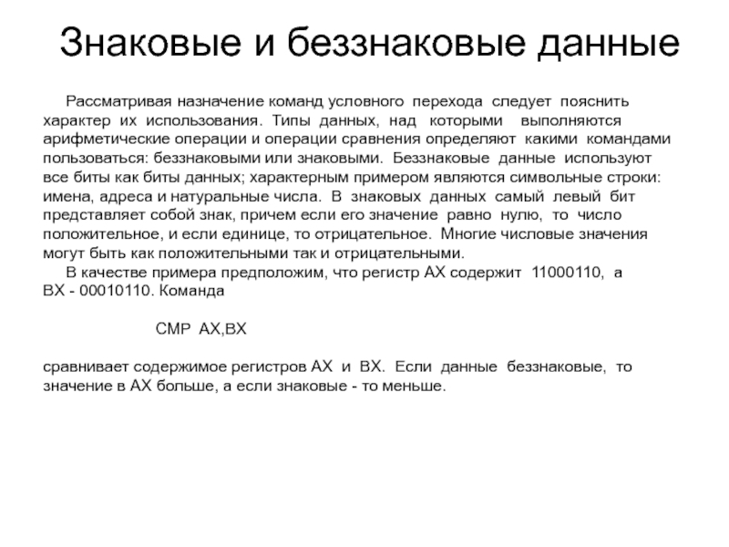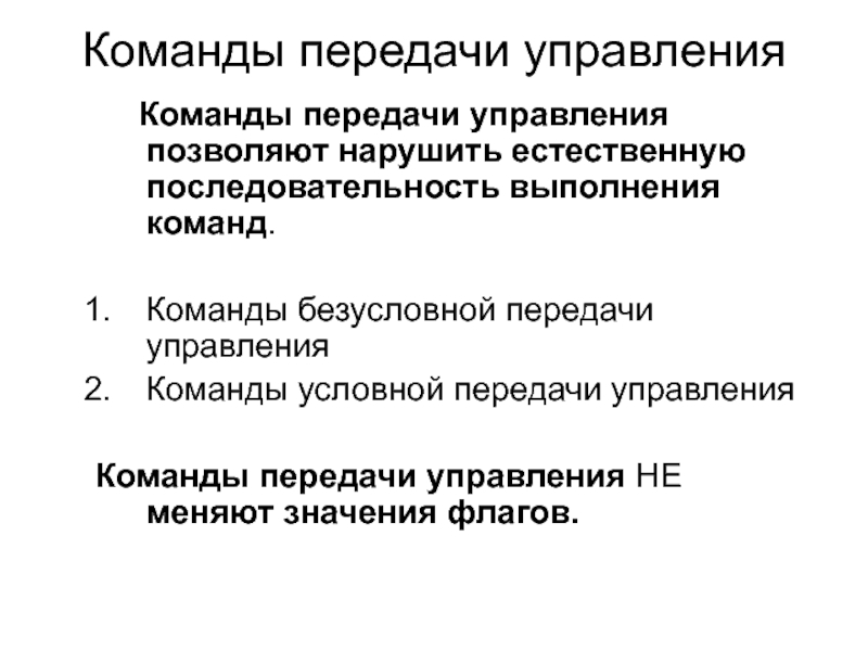 Легко заметить, что все флаги младшего байта регистра флагов устанавливаются арифметическими или логическими операциями процессора. За исключением флага переполнения, все флаги старшего байта отражают состояние микропроцессора и влияют на характер выполнения программы. Флаги старшего байта устанавливаются и сбрасываются специально предназначенными для этого командами. Флаги младшего байта используются командами условного перехода для изменения порядка выполнения программы.