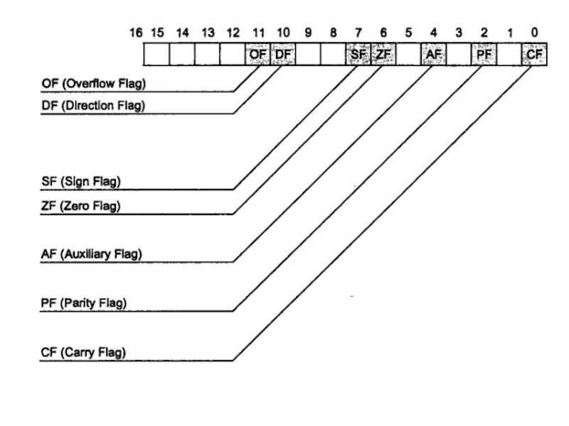 Регистр флагов. Флаги – это отдельные биты, принимающие значение 0 или 1. Регистр флагов (признаков) содержит девять активных битов (из 16). Каждый бит данного регистра имеет особое значение, некоторые из этих бит содержат код условия, установленный последней выполненной командой. Другие биты показывают текущее состояние микропроцессора.