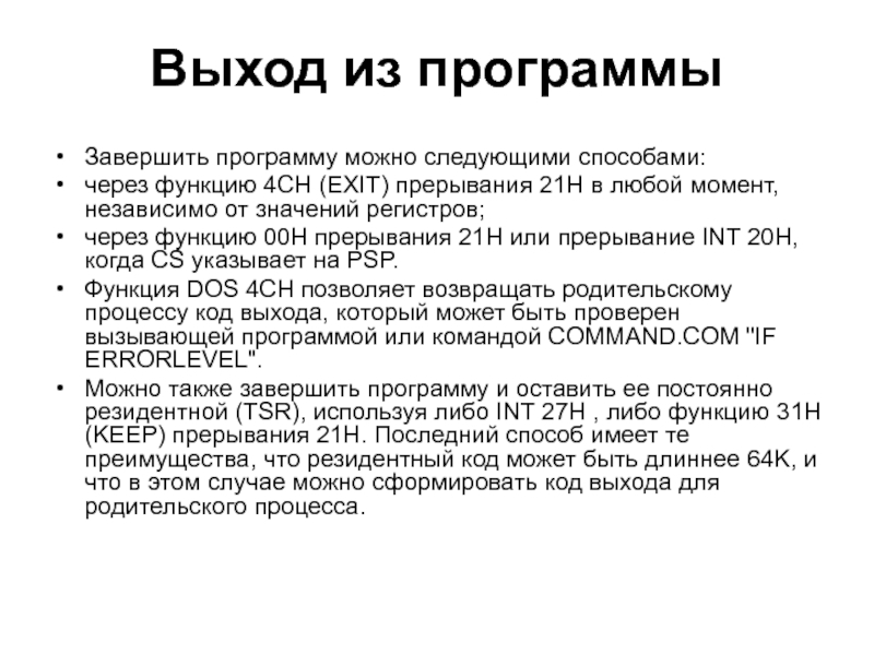 Можно также завершить программу и оставить ее постоянно резидентной (TSR), используя либо INT 27H , либо функцию 31H (KEEP) прерывания 21H. Последний способ имеет те преимущества, что резидентный код может быть длиннее 64K, и что в этом случае можно сформировать код выхода для родительского процесса.