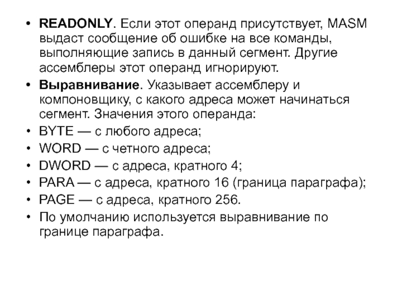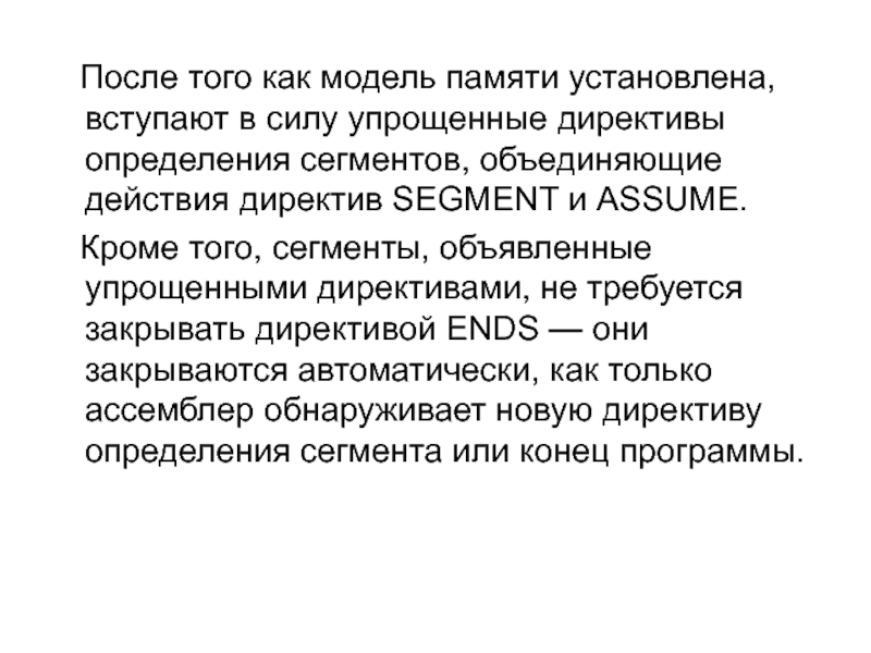 Процессор автоматически выбирает сегмент в соответствии с условиями, описанными в таблице. При сохранении операнда в памяти или загрузке из памяти в качестве сегментного регистра по умолчанию используется DS, но можно и явным образом указать сегментный регистр, применяемый в операции.