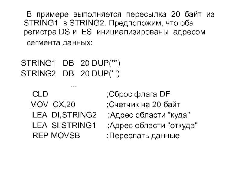 DF (флаг направления) используется командами обработки строк. Если DF = 0, строка обрабатывается в прямом направлении, от меньших адресов к большим. Если DF = 1, обработка строк ведется в обратном направлении;