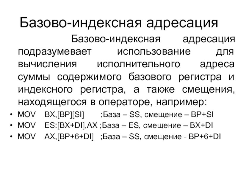Любой из названных выше 4 регистров может использоваться для хранения адреса памяти, а команды, работающие с данными из памяти, могут обращаться за ними к этим регистрам. При адресации памяти базовые и индексные регистры могут быть использованы в различных комбинациях. Разнообразные способы сочетания в командах этих регистров и других величин называются способами или режимами адресации.