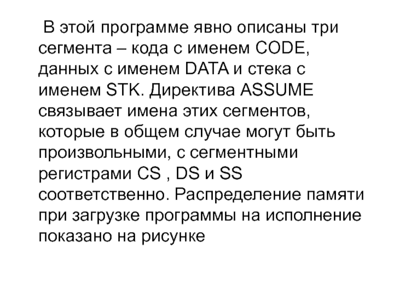сегмент данных – содержит данные, то есть константы и рабочие области, необходимые программе. Адресуется регистром DS;