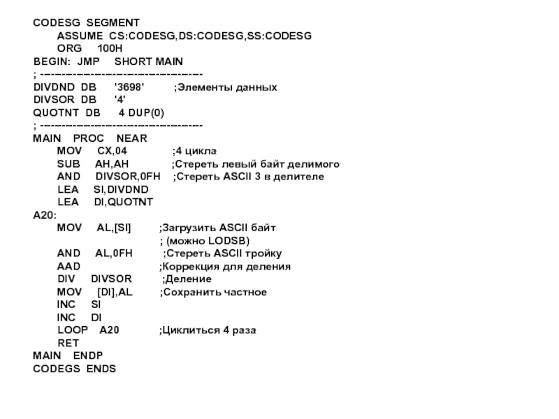 помещается в память, начиная с PSP:0100h. В общем случае, COM-программа может использовать множественные сегменты, но тогда она должна сама вычислять сегментные адреса, используя PSP как базу.