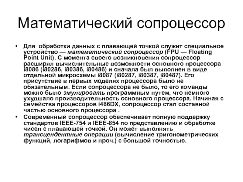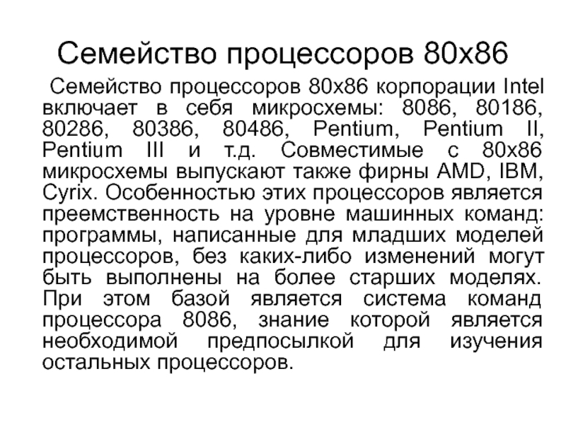 себя микросхемы: 8086, 80186, 80286, 80386, 80486, Pentium, Pentium II, Pentium III и т.д. Совместимые с 80х86 микросхемы выпускают также фирны AMD, IBM, Cyrix. Особенностью этих процессоров является преемственность на уровне машинных команд: программы, написанные для младших моделей процессоров, без каких-либо изменений могут быть выполнены на более старших моделях. При этом базой является система команд процессора 8086, знание которой является необходимой предпосылкой для изучения остальных процессоров.
