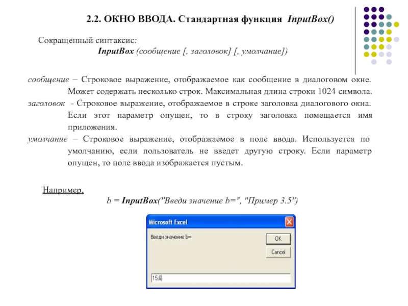 умолчание – Строковое выражение, отображаемое в поле ввода. Используется по умолчанию, если пользователь не введет другую строку. Если параметр опущен, то поле ввода изображается пустым.
