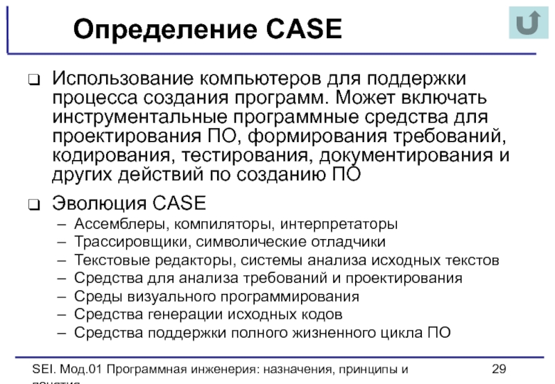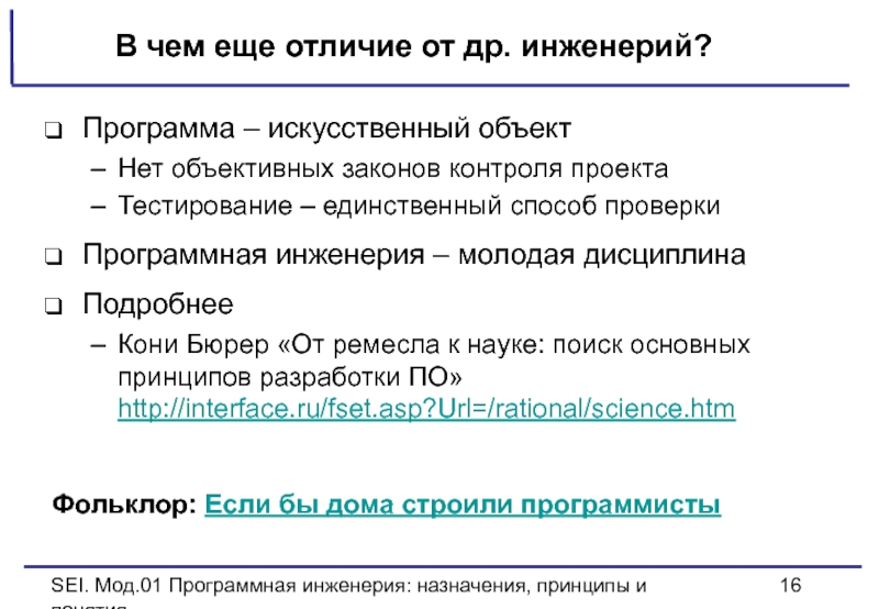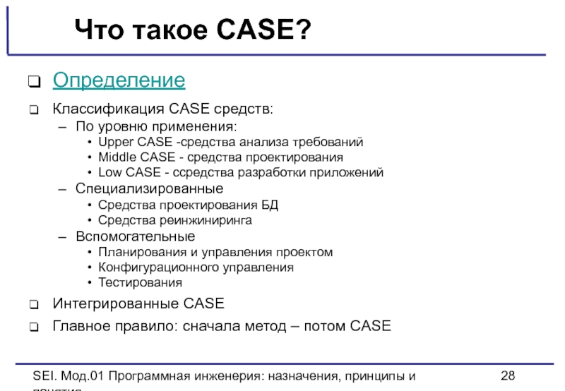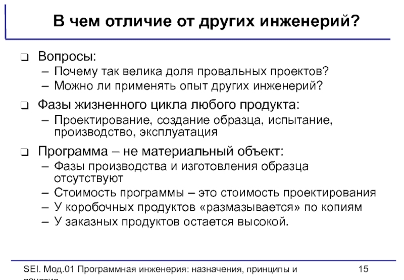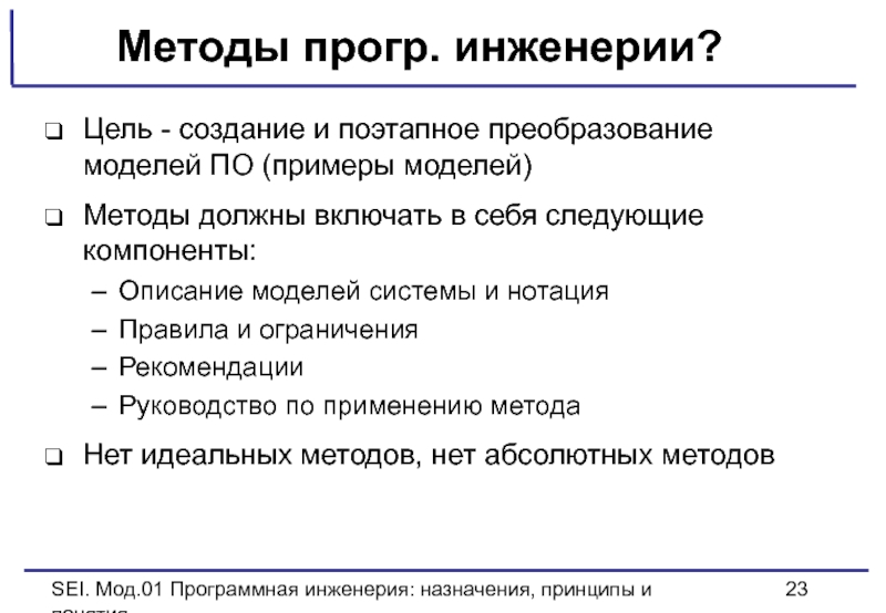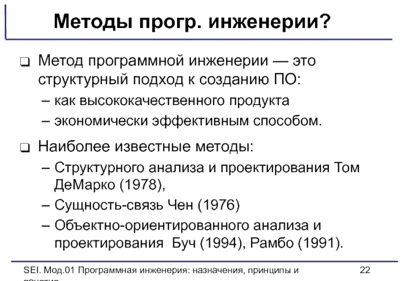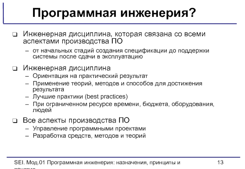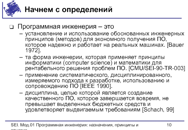 установление и использование обоснованных инженерных принципов (методов) для экономного получения ПО, которое надежно и работает на реальных машинах. [Bauer 1972].
