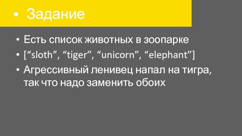a = [“sloth”, “tiger”, “unicorn”, “elephant”]