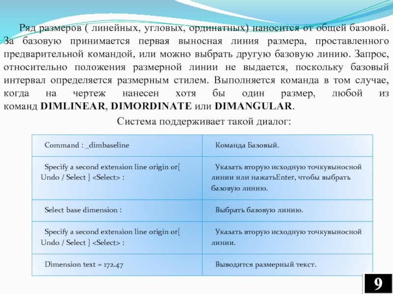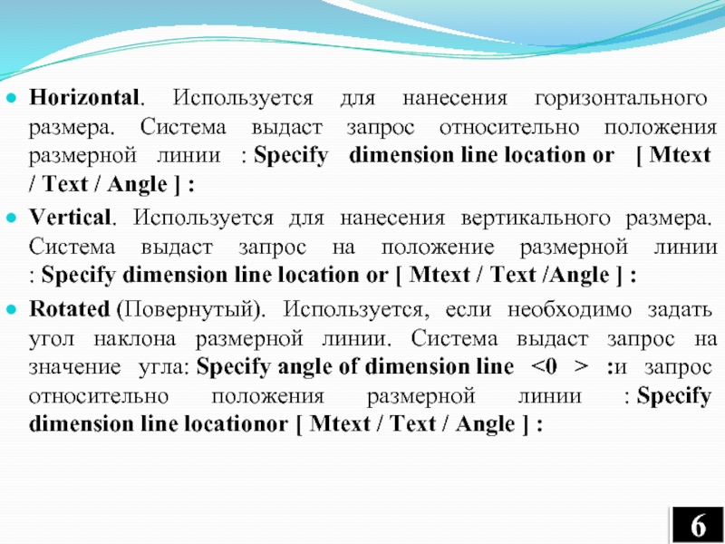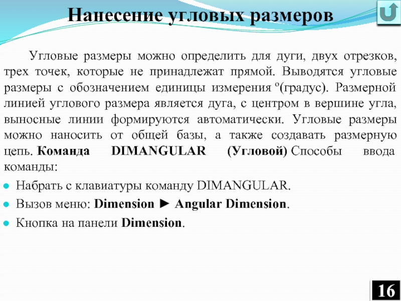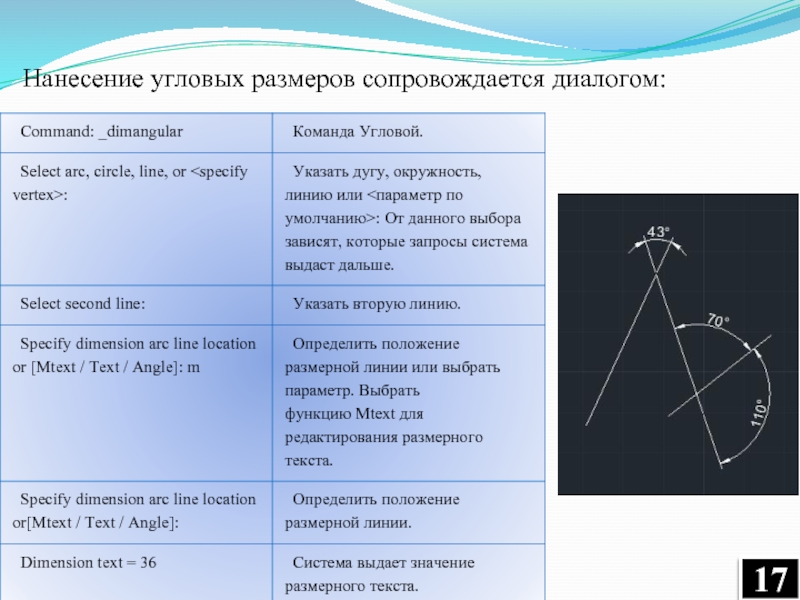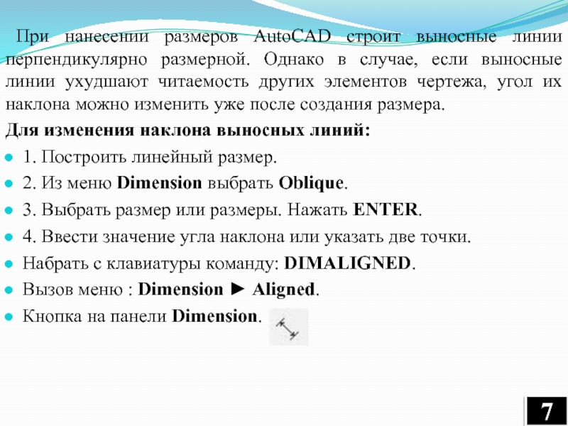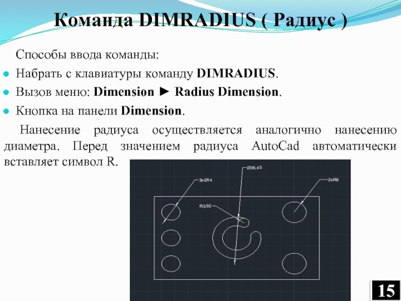 Для нанесения диаметра ввести команду одним из способов. На запрос: Select arc or circle : показать перекрестком любую точку объекта. AutoCad позволяет создать размерную линию произвольной длины и разместить ее под любым углом. Пользуясь опциями команды, можно редактировать размерный текст, а также изменить угол его наклона . Перед значением диаметра AutoCad автоматически вставляет символ . Размерная линия для данного размере не должна быть вертикальной или горизонтальной.