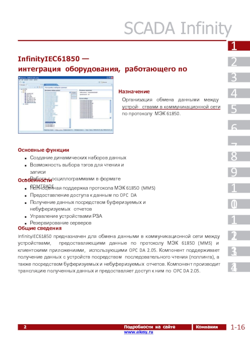 InfinityIEC61850 предназначен для обмена данными в коммуникационной сети между устройствами, предоставляющими данные по протоколу МЭК 61850 (MMS) и клиентскими приложениями, использующими OPC DA 2.05. Компонент поддерживает получение данных с устройств посредством последовательного чтения (поллинга), а также посредством буферизуемых и небуферизуемых отчетов. Компонент производит трансляцию полученных данных и предоставляет доступ к ним по OPC DA 2.05.