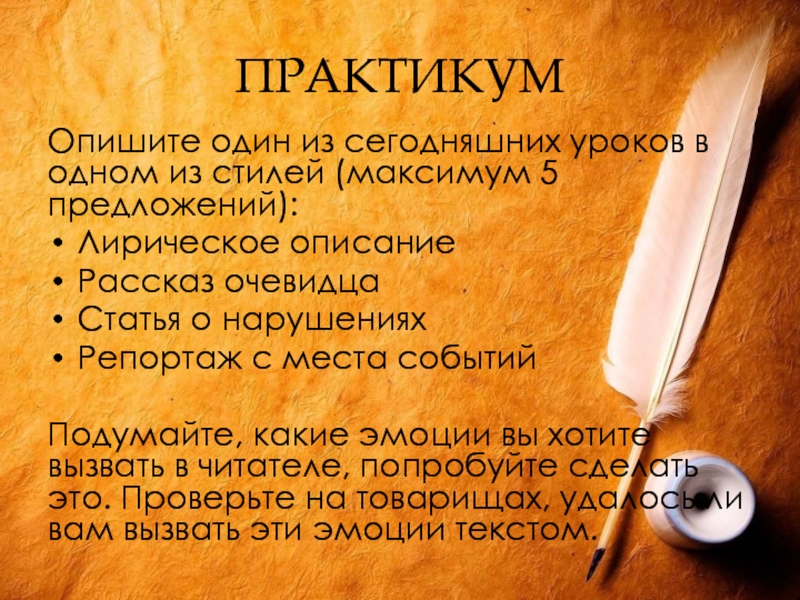 Опишите один из сегодняшних уроков в одном из стилей (максимум 5
