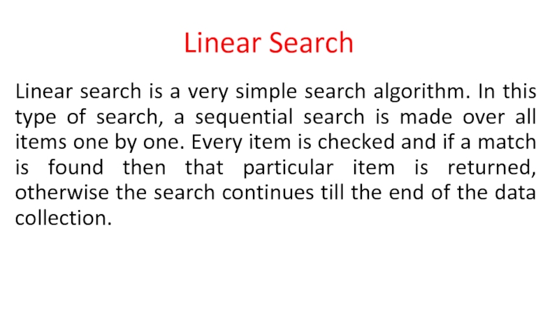 type of search, a sequential search is made over all items one by one. Every item is checked and if a match is found then that particular item is returned, otherwise the search continues till the end of the data collection.