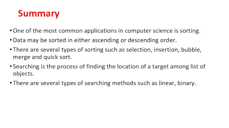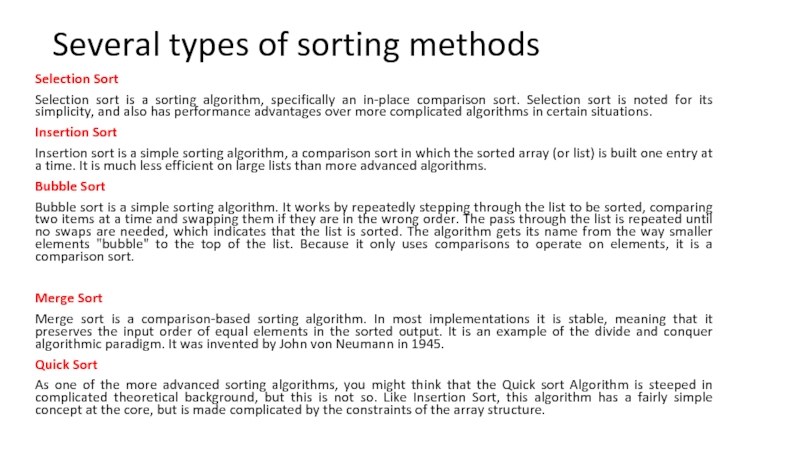 There are several types of sorting such as selection, insertion, bubble, merge and quick sort.