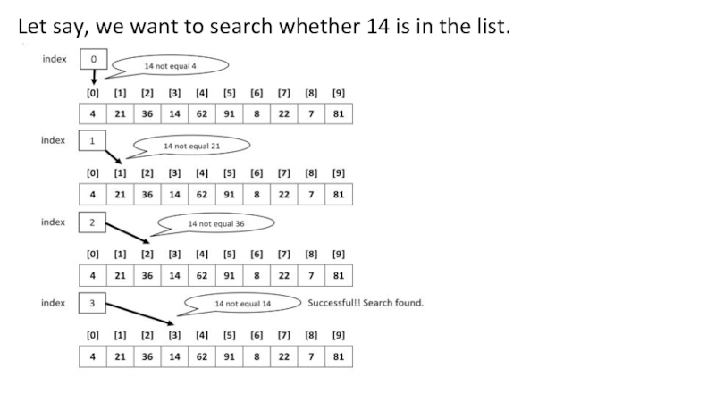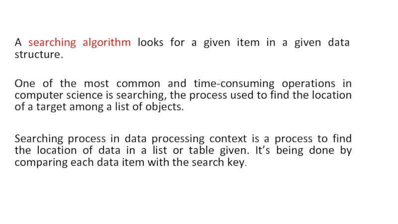 Searching process in data processing context is a process to find the location of data in a list or table given. It’s being done by comparing each data item with the search key.