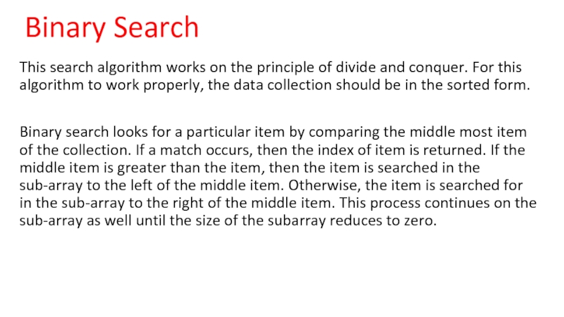 Binary search looks for a particular item by comparing the middle most item of the collection. If a match occurs, then the index of item is returned. If the middle item is greater than the item, then the item is searched in the sub-array to the left of the middle item. Otherwise, the item is searched for in the sub-array to the right of the middle item. This process continues on the sub-array as well until the size of the subarray reduces to zero.