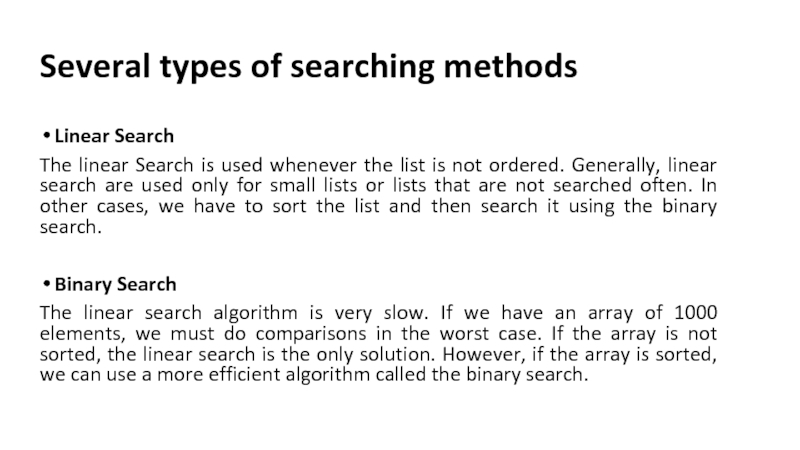 used whenever the list is not ordered. Generally, linear search are used only for small lists or lists that are not searched often. In other cases, we have to sort the list and then search it using the binary search.