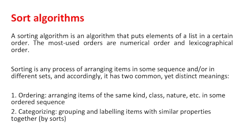 Sorting is any process of arranging items in some sequence and/or in different sets, and accordingly, it has two common, yet distinct meanings: