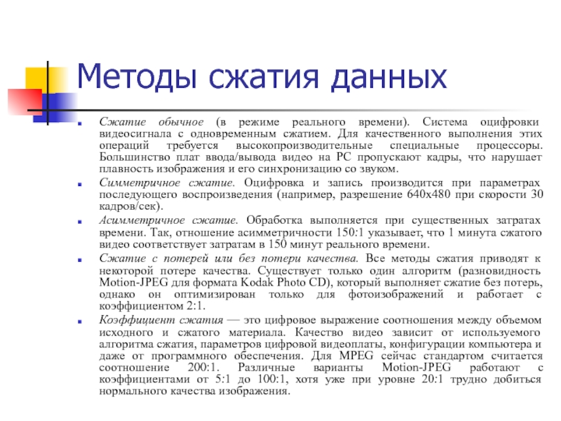 Сжатие с потерей или без потери качества. Все методы сжатия приводят к некоторой потере качества. Существует только один алгоритм (разновидность Motion-JPEG для формата Kodak Photo CD), который выполняет сжатие без потерь, однако он оптимизирован только для фотоизображений и работает с коэффициентом 2:1.