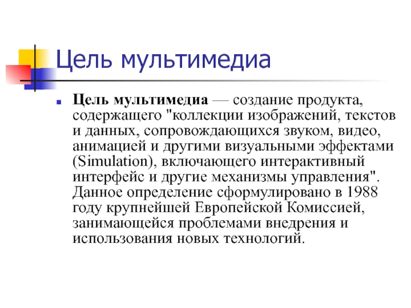 данных, сопровождающихся звуком, видео, анимацией и другими визуальными эффектами (Simulation), включающего интерактивный интерфейс и другие механизмы управления". Данное определение сформулировано в 1988 году крупнейшей Европейской Комиссией, занимающейся проблемами внедрения и использования новых технологий.