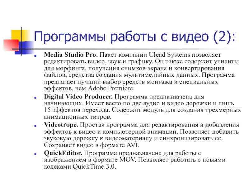 QuickEditor. Программа предназначена для работы с изображением в формате MOV. Позволяет работать с новыми кодеками QuickTime 3.0.