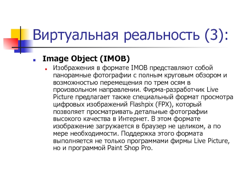 фотографии с полным круговым обзором и возможностью перемещения по трем осям в произвольном направлении. Фирма-разработчик Live Picture предлагает также специальный формат просмотра цифровых изображений Flashpix (FPX), который позволяет просматривать детальные фотографии высокого качества в Интернет. В этом формате изображение загружается в браузер не целиком, а по мере необходимости. Поддержка этого формата выполняется не только программами фирмы Live Picture, но и программой Paint Shop Pro.