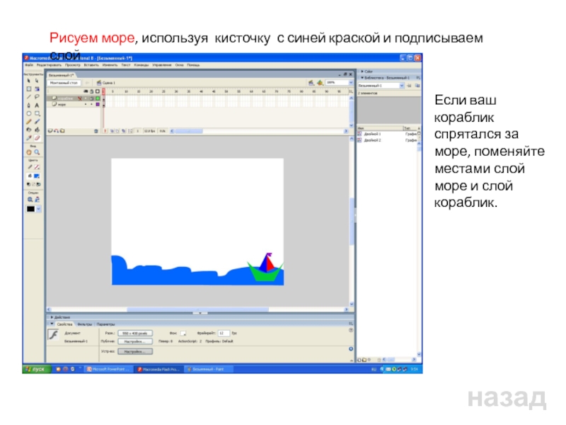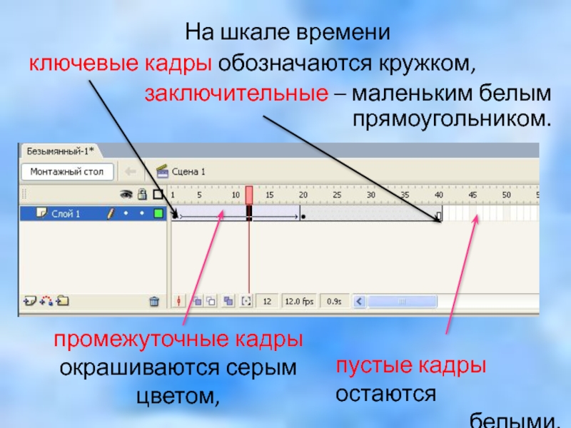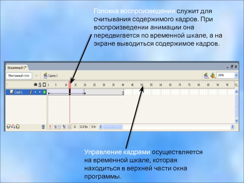 Головка воспроизведения служит для считывания содержимого кадров. При воспроизведении анимации она передвигается по временной шкале, а на экране выводиться содержимое кадров.