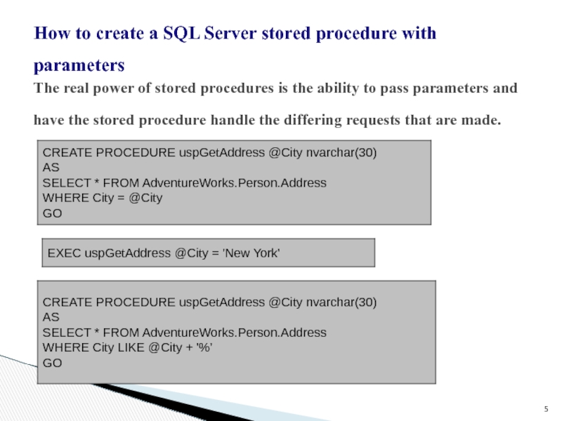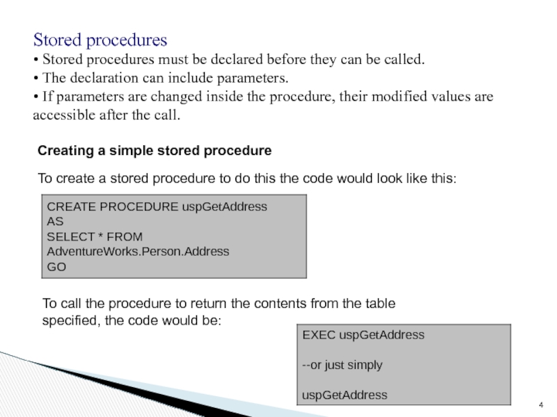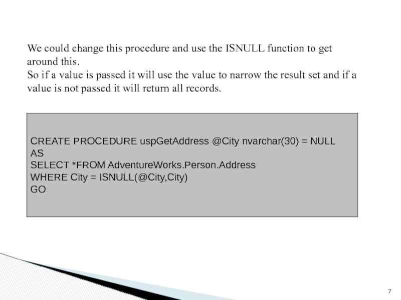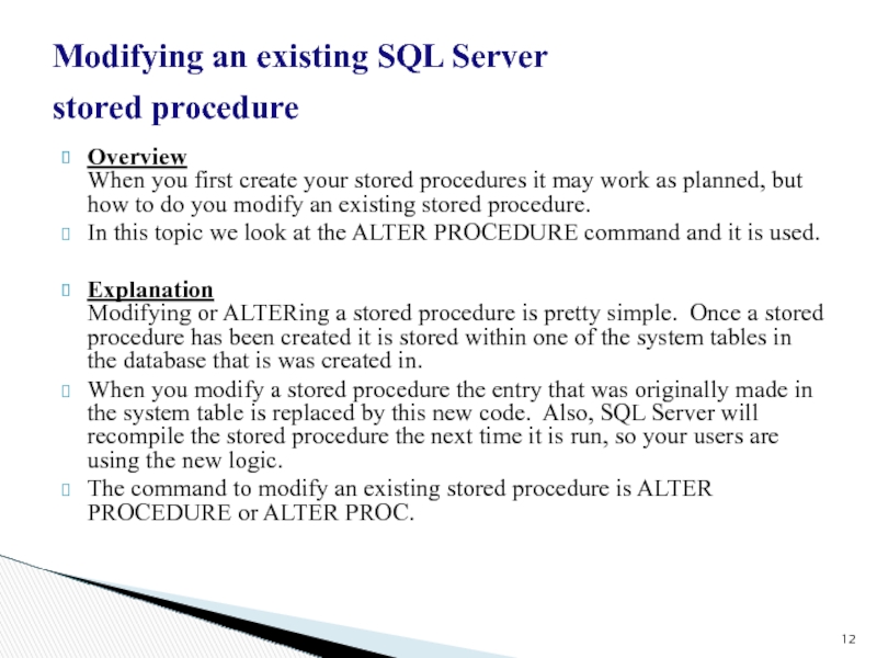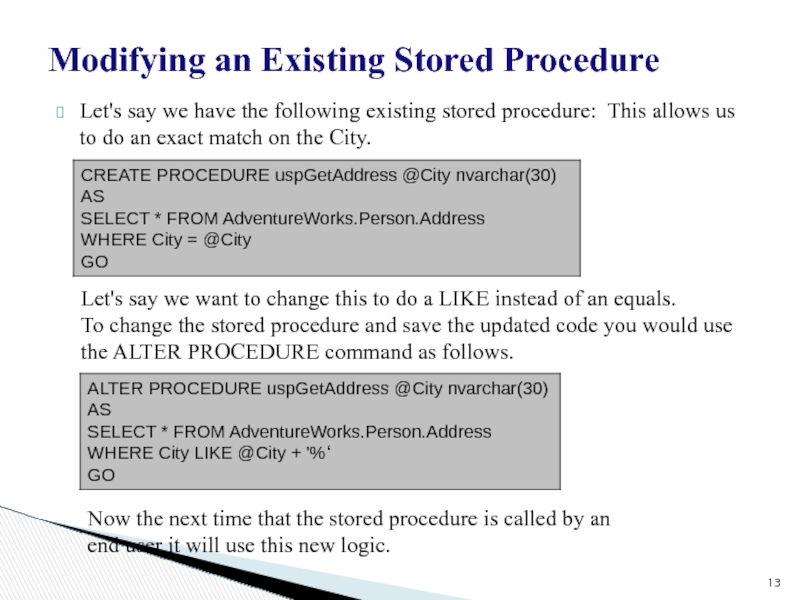 To change the stored procedure and save the updated code you would use the ALTER PROCEDURE command as follows.