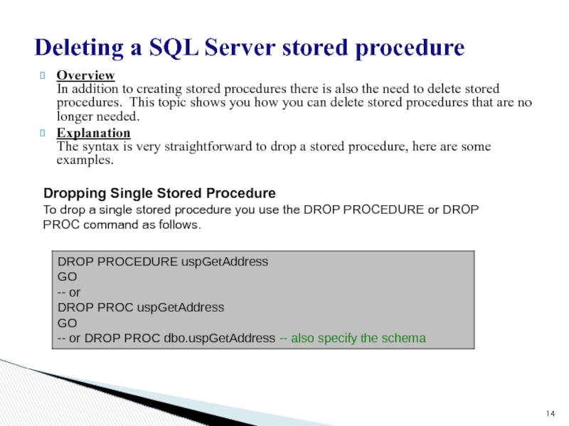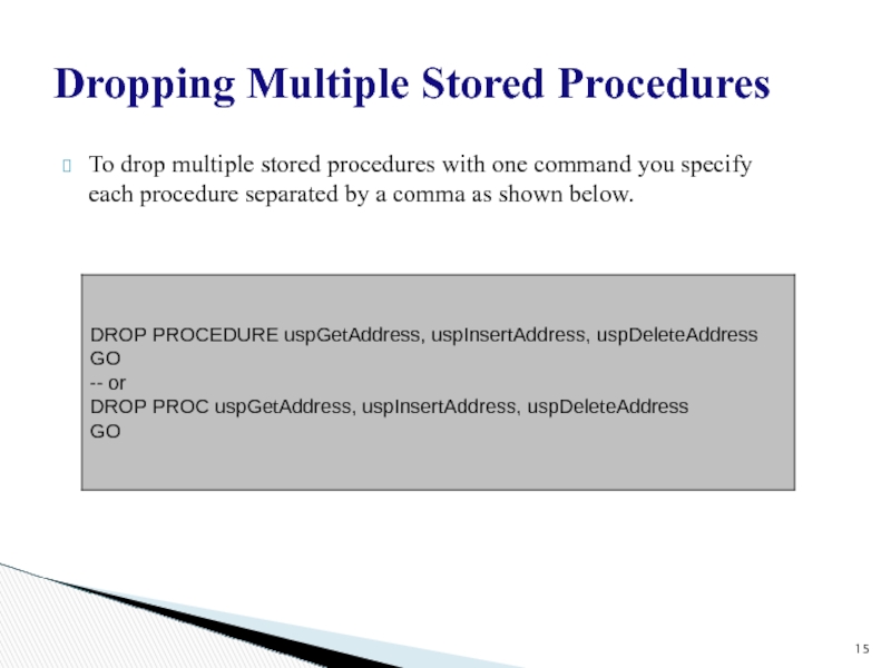 To drop a single stored procedure you use the DROP PROCEDURE or DROP PROC command as follows.