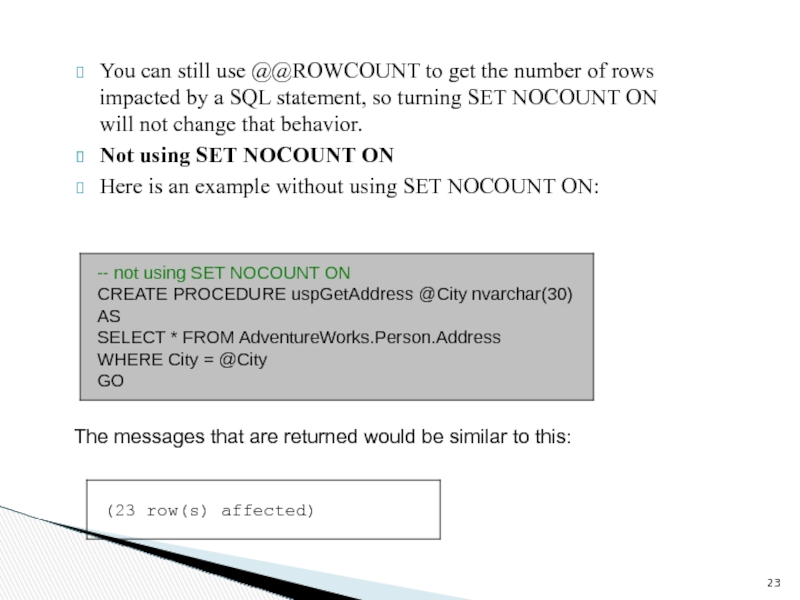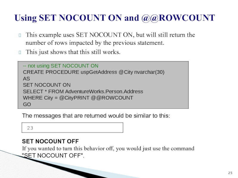 If you wanted to turn this behavior off, you would just use the command "SET NOCOUNT OFF".