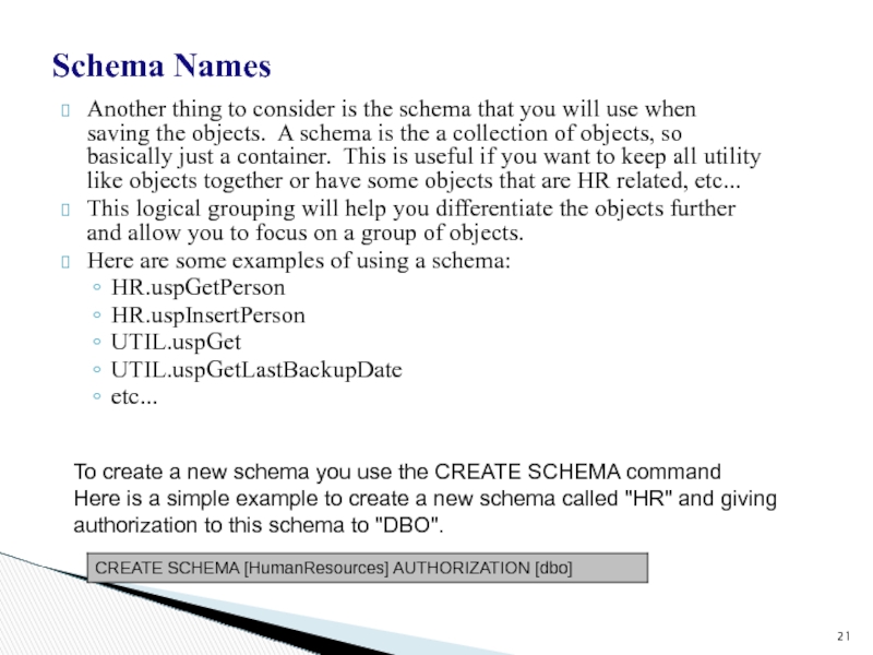 Here is a simple example to create a new schema called "HR" and giving authorization to this schema to "DBO".