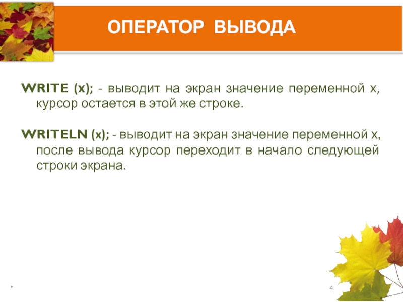 Имя программы, раздел описания переменных и каждый оператор отделяются друг от друга точкой с запятой. В конце программы после end – точка.