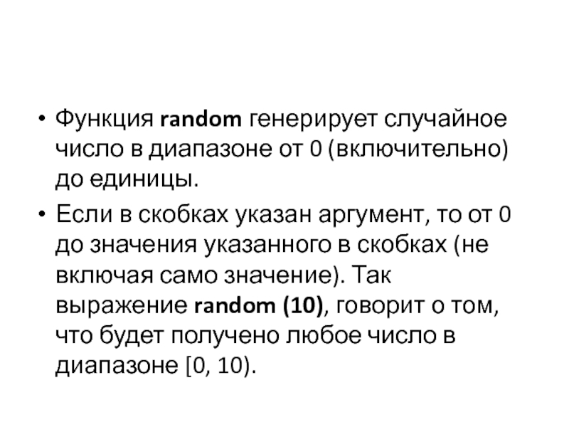 в скобках указан аргумент, то от 0 до значения указанного в скобках (не включая само значение). Так выражение random (10), говорит о том, что будет получено любое число в диапазоне [0, 10).