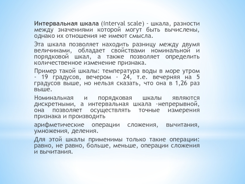 Для этой шкалы применимы только такие операции: равно, не равно, больше, меньше, операции сложения и вычитания, умножения и деления.
